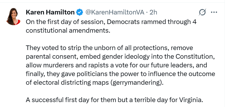 The move prompted immediate criticism from Republicans, including freshman Delegate Karen Hamilton, who was sworn in the same day to represent parts of Culpeper, Greene, Madison, and Orange counties. In a post on X, Hamilton accused Democrats of “ramming through” amendments that she said undermine protections for the unborn, weaken parental rights, politicize elections, and alter long-standing constitutional norms.