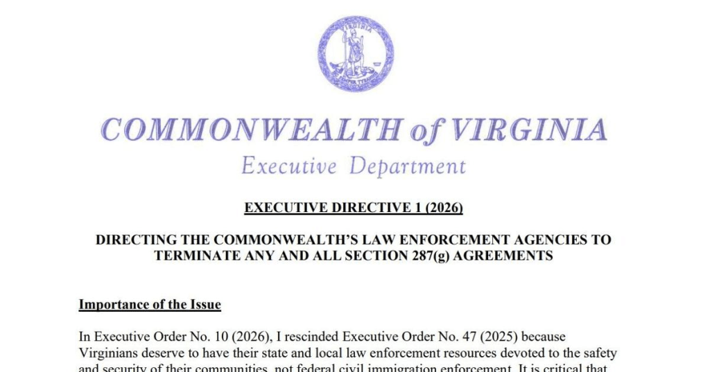 Virginia Gov. Abigail Spanberger has issued an executive directive terminating the Commonwealth’s participation in the federal 287(g) program—the long-standing agreement that allowed the Virginia State Police and the Department of Corrections to assist federal authorities in identifying and arresting criminal illegal aliens.